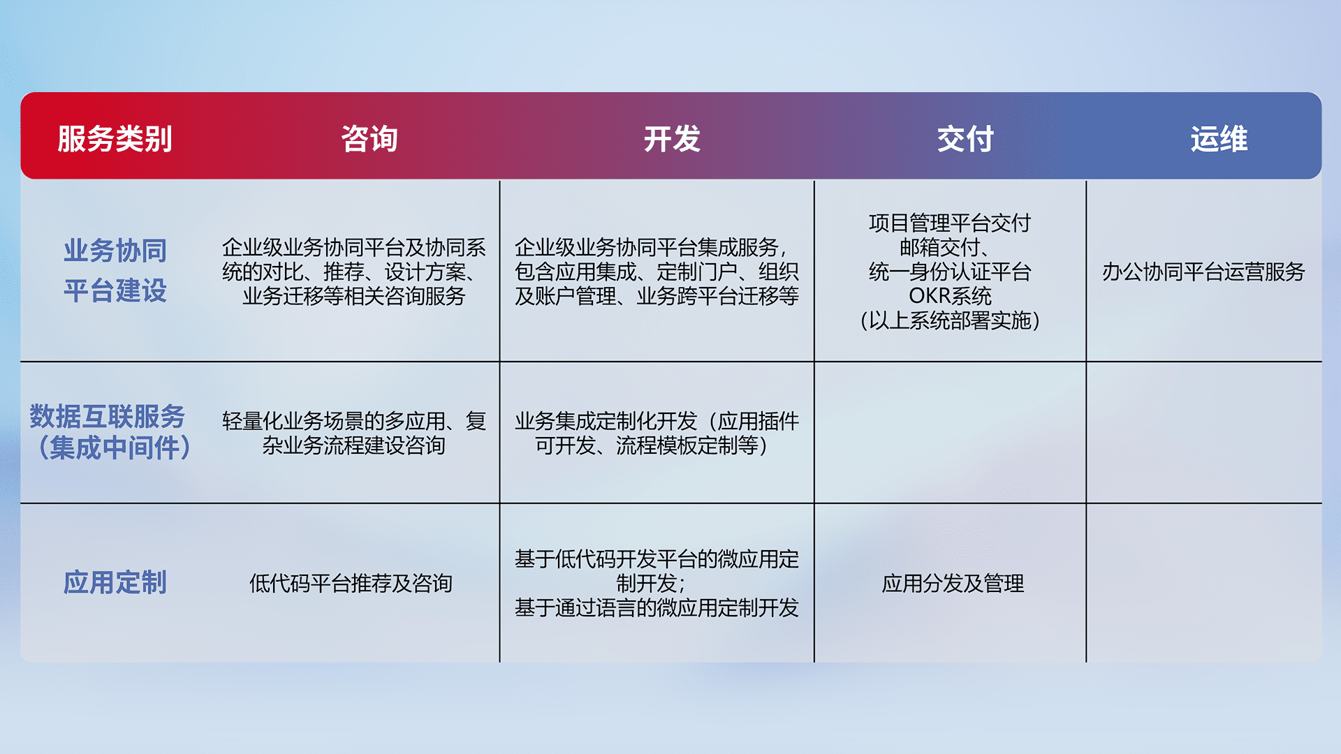 针对钉钉、、、、企微、、IDaas等平台级产品提供产品的规划、、、、方案、、交付、、、定制化开发等服务,,实现如统一协同办公、、、、智能客户服务、、、、混合会议管理、、智能数据查询、、、、等业务场景,,,实现数字化转型。。。